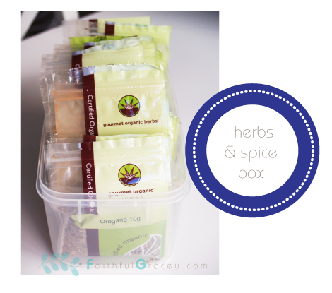 I also find that bottled spices take up so much room, and as i love to cook i have quite a collection of various herbs and spices so i like to buy them in sachets. This way i can line them up neatly in a long plastic container, and ‘file’ through them as i need.