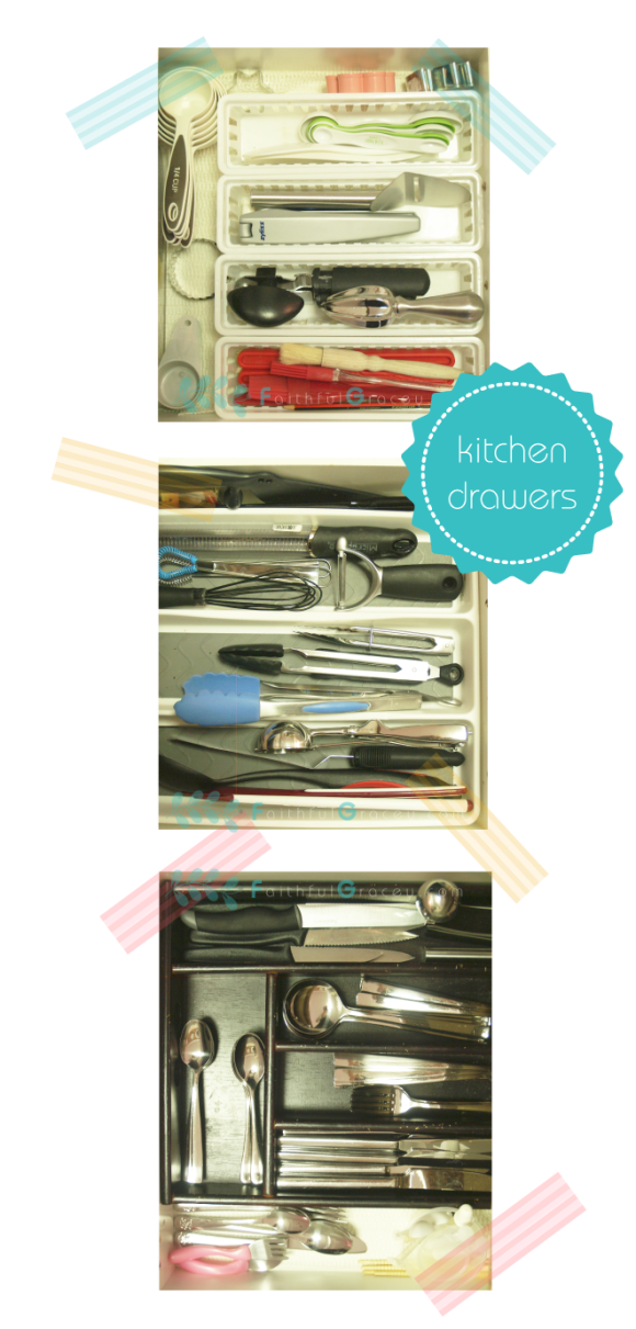 In our little rented town house, we have a very small kitchen that only has four drawers. Four very small and shallow drawers. because i love to cook, i have a habit of collecting different types of cooking utensils etc. This has not worked to my advantage as I clearly do not have the space for all my wonderful gadgets. I have therefore ruthleslley gone through my treasures and boxed what ever item i do not use at least once a week.  This box lives in the pantry. It is actually quite a tricky task narrowing down what to keep at hand, as i find myself saying ‘ oh but what if i need that ‘melon ball scooper’, or the ‘julian slicer’ … i have had to be really strict with myself to avoid over clutter, which would land up stressing me out when I’m trying to locate a simple potato peeler amongst the four different kinds of lettuce knives and measuring cups. This is not ideal when you are trying to cook dinner with a toddler demanding  your attention every 5 minutes, and a very thoughtful husband who does unpack the dishwasher but puts the peeler in a different drawer each time ( bless him for trying though)  .The 3 drawers shown above are strictly items that i cannot live without when it comes to cooking. the larger wooden/metal spoons,mashers etc live in a utensil jar next to the stove. One day when we have a home of our own, i plan to have lots of large beautiful drawers to house all my lovely tools.